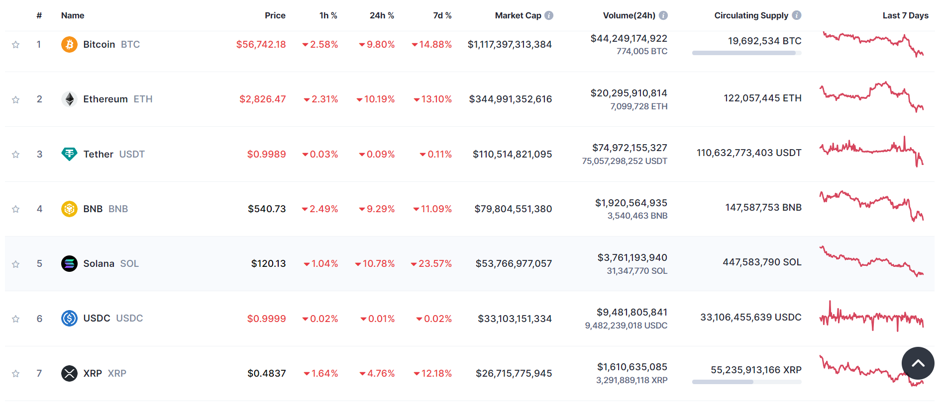 Vervolgens ging de vrije val verder en kon Bitcoin ook bij $62k niet standhouden en stuiterde verder naar beneden naar een huidige koers van $57k.