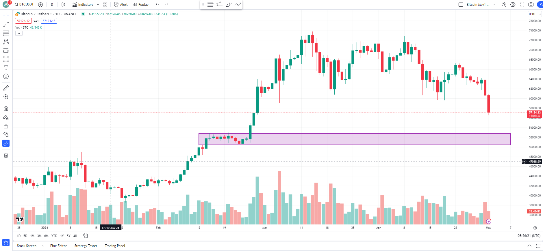 De eerste grote supportzone waar veel liquiditeit ligt is de range van $50 – $52k, dus we kunnen nog veel lager…