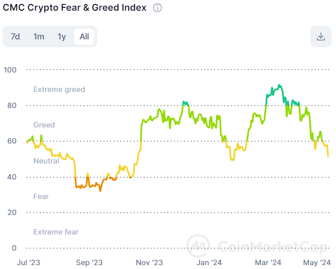 Fear & Greed index valt terug naar Neutral, wat op zich een goed teken is. Een adempauze naar een volgende top?